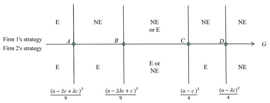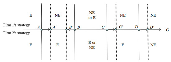 Finally, for (E, NE) to be a Nash Equilibrium, we need or , which happens if for . Given the condition that and , we can get if or and . Therefore, (E, NE) may occur if or and . □