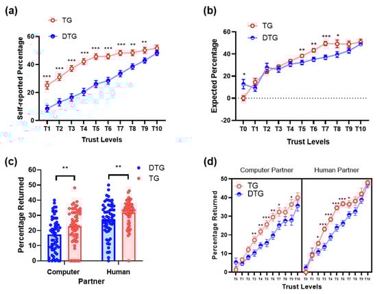 In addition, independent-sample t-tests with Game (TG, DTG) as a between-subjects factor were performed on percentages returned separately for each level of trust.