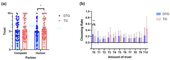 The trust decision in the trust game (TG) and distrust game (DTG) groups. (a) Average trust. The mean trust amount (out of Ұ10) for human and computer-mediated human partners. Bars and error lines indicate the mean values and the standard errors of means. Raw data points are overlaid. (b) Average choosing rate. The average choosing rate of each amount of trust across participants when interacting with human partners. Bars and error lines indicate the mean values and the standard deviations. * p < 0.05, ** p < 0.01.
