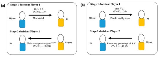 Framing effects have also been studied in the context of trust and reciprocity behaviors, employing the two-person reciprocal TG (also referred to as the investment game) []. For example, Evans and Beest (2017) examined changes in trust and reciprocity behavior by presenting the TG in the context of a gain vs. a loss frame []. In the gain frame, participants started at 0 points and received different amounts depending on their decision, whereas, in the loss frame, participants started at 1200 points and lost some or all of these points upon certain choices. If participants used the same strategy in both frames, they would have the same final outcomes. The results showed that decisions under the loss frame compared to the gain frame increased average trust behavior but not reciprocity behavior, suggesting that the loss frame makes trustors less likely to apply a calculative mindset. Further, these changes were only evident when participants interacted with human but not computer partners, demonstrating the unique social consequences of the loss frame.