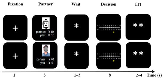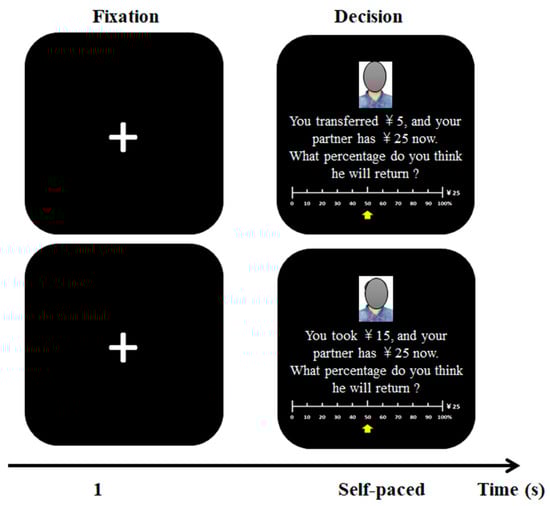 In the TG, both trustors and trustees received an initial amount of Ұ10. In the first stage, trustors decided to give any portion of their endowment to trustees (i.e., ҰX (X ∈ 0, 1, …, 10)) and the given amount was tripled by the experimenter (Figure 3a). For example, if a trustor gave Ұ5, the amount was tripled, and the trustee received Ұ15, plus the original endowment of Ұ10; the trustee then had Ұ25. In the second stage, trustees decided which percentage (i.e., 0–100% in 10% increments of ҰY (Y∈10, 13, …, 10 + 3X)) to return to trustors. For example, if a trustee had Ұ25, and he decided to return 40%, then the trustor received Ұ10 and left Ұ15 for the trustee, resulting in earnings of Ұ15 for both players. The amount given by trustors in the first stage measured trust (i.e., X), and the percentage returned by trustees in the second stage measured reciprocity (e.g., 10%).
