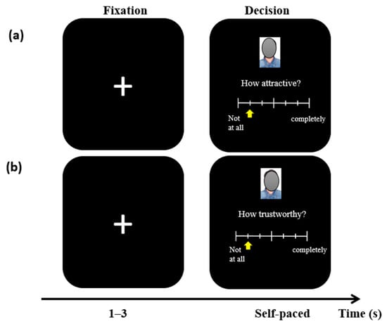 The rating of attractiveness (a) and trustworthiness (b) of each partner. After a Fixation was shown (1–3 s), the Decision screen showed the face of the partner and the rating scale. Participants made their ratings by moving the arrow with the left or right arrow key. They locked their choices by pressing the enter key. Participants made their ratings at their own pace. Note. The texts in the original picture are in Chinese. They are translated into English for communication purposes.