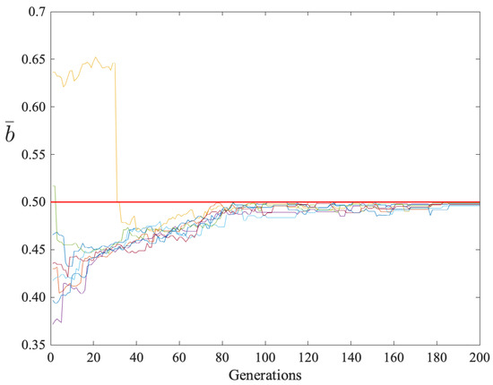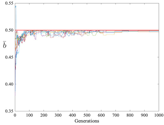 Row sample means versus generations for players. There are 10 colored graphs, each showing how a player’s sample mean varied during evolution. The red line is at .