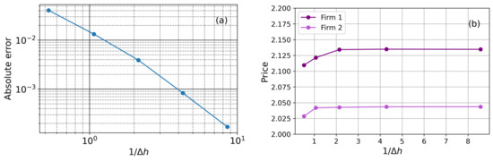 Convergence with mesh size. (a) Absolute error of price vector; (b) prices of two firms.
