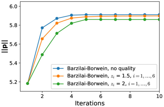 where the superscript denotes the iteration number. is the adaptive step size obtained by the application of the Barzilai–Borwein method. is set to 0.1, while the other adaptive values are defined in Equation (15).