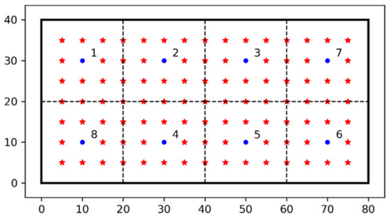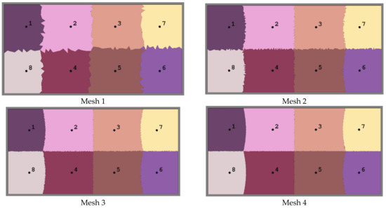 The numerical determination of Voronoi cells with regard to the utility function is performed by dividing the total area into small triangles. It is assumed that each triangle belongs to the consumer area of a single store. The consumer area of each triangle is determined by the utility function applied to the center point of the triangle. The accuracy of the results is improved by reducing the size of the triangles and increasing their number. Gmsh software [53] is used to generate a mesh of triangles. An example of such a division of the total area into small triangles is presented in Figure 1.