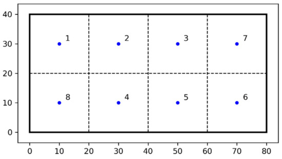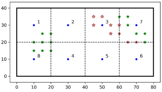This sub-section investigates the best locations for a new store. The scenario from the previous sub-section is considered, i.e., a partial cartel from firms 3–6, a profit maximization strategy for firms 1, 2, 4 and 7 and a market share maximization strategy for firm 8. It is assumed that the new store offers a lower-quality product, and two cases are analyzed. The first case considers that the new store is part of firm 7, i.e., firm 7 obtains a second store. In this case firm 7 attempts to maximize its joint profits from both stores, allowing to set different prices for each store. The second case considers that the new store is part of an independent new participant/firm on the market. The possible locations for the new store are shown in Figure 12.