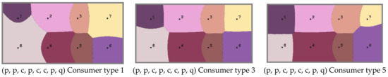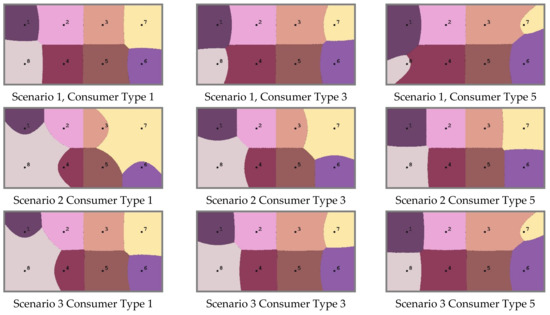 The solution of the derived optimization problems requires knowledge of the demand function for each firm by a given vector of prices. The demand function involves the determination of the consumer area of each firm, which depends on the utility function. For a given location of a consumer—for example, —one needs to compare all the utility functions defined for the consumer’s location and each store and assign the store to the location and, respectively, the firm that derives the highest utility. In this way, the area under analysis is divided among all firms, and each firm has its own consumers located in the area assigned to the firm. Once the consumer areas of each firm are known, the demand functions are obtained by taking into account the consumer area and consumers’ density, as shown in Section 4.