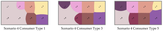 Comparison of consumer areas of Scenario 4 with different cartel structures.