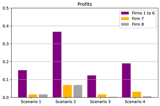 A similar analysis including all possible combinations of cartels among firms 1 to 6 is generated when firm 8 follows a profit maximization strategy. In this case, all six firms would prefer to stay in the cartel, since it ensures higher profits than any other combination. Firms 1, 2, 4 and 6 might achieve higher profits if only one of them leaves the cartel, but if two or more firms leave the cartel, the profits become lower for them and thus all would prefer to remain part of the cartel.