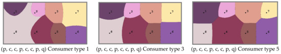 It is important to note that the demand function does not depend only on consumer type. The demand function defined in Equation (12) shows that it is determined by consumer’s area and consumer’s density. The consumer’s area is determined by the utility function, which depends not only on consumer’s type, but also on price, distance and quality. Hence, the demand function also depends on price, distance and quality.
