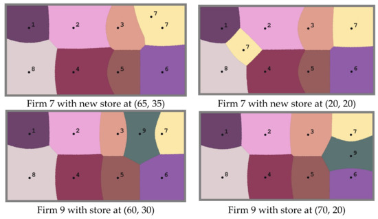 Figure 13 shows that the cartel might break up or it might remain stable for some of the best locations for firm 9. It was observed in [57] that the cartels are unstable due to the entry of a new participant to the market that leads to additional competition. The current analysis shows that new participant might enter in the market without breaking up the cartel and still obtaining one of the highest possible profits by keeping high prices due to “cartel umbrella”. The complex interactions between participants that exist in the two-dimensional space offers variability of choices for new participants. The cartel fails if the new store is located at (60, 30), while the cartel remains stable if the new store is located at (70, 20), even though these locations are equally distant from firm 7 and from the stores from the cartel. In the case of setting a new store at the first location, firm 3 prefers to leave the cartel and increase its market share to the detriment of firm 2. Meanwhile, in the second case, firm 6 cannot significantly increase its market share due to its location, and it does not obtain any benefits from leaving the cartel.
