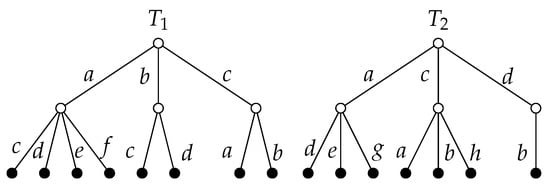 where is the tree-edit distance between and , and is the weight of edit operations. Since there is no need to weigh edit operations differently, we may take to be one for all operations. Then, as shown by Li and Zhang [], the formula is valid as a metric. Since calculating the distance between two trees is equivalent to calculating their similarity and subtracting it from one, we define the tree-edit similarity as