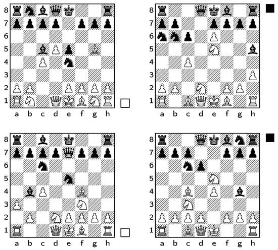 MCTS constitutes an evolution from traditional methods, which are decision-making mechanisms that assign a utility to “features” of a game position and select a continuation based on max–min solution concepts (for a detailed description of these methods, see []). MCTS-based agents dominate many games of perfect information, such as Go, Checkers, Reversi, and Connect Four []; witness the impressive achievements of the DeepMind team against human players [,]. Nonetheless, MCTS-based agents still trail behind their counterparts when playing game positions requiring accurate play. Recent evidence of this fact was provided in game 6 of the 2018 Chess Championship Match between World Champion Magnus Carlsen (White) and challenger Fabiano Caruana (Black), where DeepMind’s AlphaZero missed a mate for Black following a sequence of 30 moves, found by the Sesse supercomputer running this line on the non-MTCS-based Stockfish [].