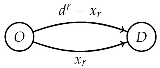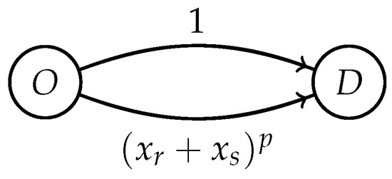 Let be a nonempty finite set of player (or vehicle) populations such that players in the same population share the same available route choices (or strategy set). For population , the demand for a population, i.e., the traffic volume associated with that population, is . Each population i has a nonempty finite resource set made up of relevant resources, i.e., those edges that are used in at least one route choice, , where is the strategy set of i. Denote E as the irredundant resource set , the set of edges used in any strategy set. Resource cost functions, such that , are assumed to be continuous, nondecreasing, and non-negative.