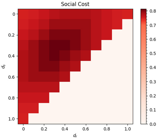 We can write this as a two-player (r and ) normal form game with the actions , , , and . This, combined with the inequalities above, indicates that the payoffs comply with the conditions required for a social dilemma. As such, the PoA is strictly greater than 1. □