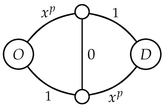 The Braess example where . With , the cost functions are linear, and for , the cost functions are quadratic.