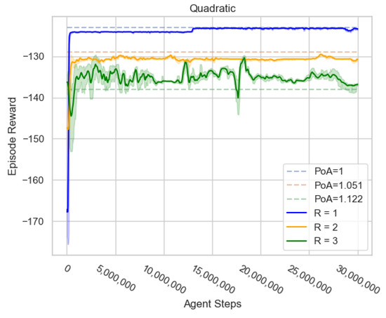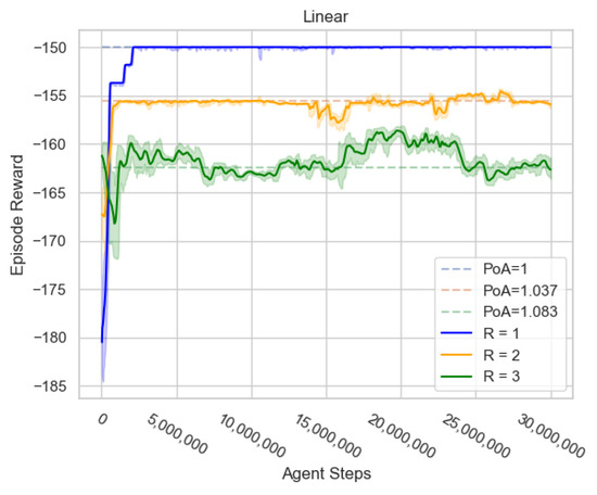 We used the Asynchoronous Advantage Actor–Critic (A3C) algorithm [46], due to its use in multi-agent RL social dilemma environments, e.g., [48,49]. We simulated instances with either one, two, or three route planner agents controlling the flow. Each game consisted of playing the network control game shown in Figure 8 and Figure 9 for 100 repeated rounds with no discounting (). Thus, the SO cost is 150 or 123 for linear and quadratic costs, respectively. In both instances, the worst possible cost is 200. Each instance was averaged over three different random seeds. The neural network consisted of two fully connected layers of size 32 and a Long Short-Term Memory (LSTM) recurrent layer [50]. This network architecture was taken from [48]. We used the Ray library (https://github.com/ray-project/ray, accessed 10 January 2021) for a standard implementation of A3C with default parameter settings.