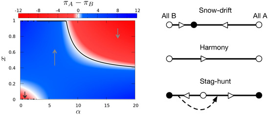 44]. The encouragement of diversity can be modeled as a snowdrift game, where deviating from the partner’s strategy is the equilibrium solution. The game derives its name from a metaphorical scenario where two drivers are stuck in a snowstorm, and if neither shovels the snow, they cannot get home, but if both shovel the snow, they can go home quickly. However, if one shovels, the other can stay in the car, waiting for the job to be done. In the Nash equilibrium solution, one person shovels and the other stays in the car. To avoid any implication of antagonistic interaction, we will use the snowdrift game instead of the hawk and dove metaphor (both metaphors represent the same game). The snowdrift game introduces incentives that allow the coexistence of strategies in well-mixed populations and in structured populations [