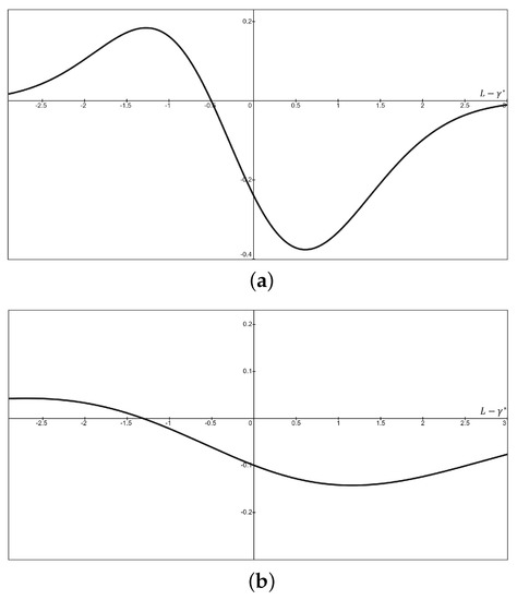 Figure 1 depicts the condition for . For both figures, when the curve is above the x-axis, , meaning the limit on aggressiveness can reduce the aggressive behavior. When the curve is below the x-axis, , meaning the limit on aggressiveness can induce more aggressive behavior. We find that the accuracy of the inspection measure changes the value of the condition and the shape of the curve. Figure 1a assumes that the measurement error follows the standard normal distribution, and Figure 1b doubles the standard deviation making the inspection measure less accurate.