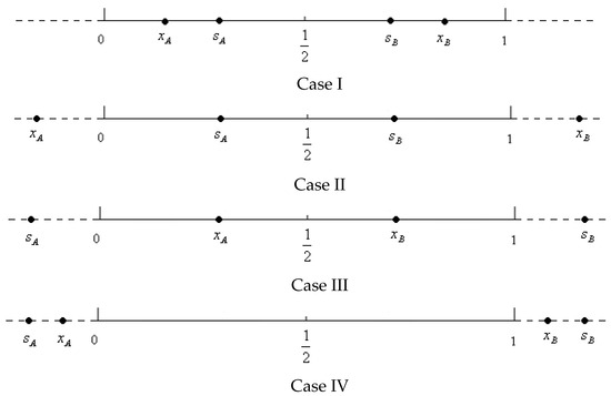 We follow Matsushima (2004) [18] and Brekke and Straume (2004) [19] by assuming that there are two input suppliers, Supplier A and Supplier B, of essential inputs. However, differently from Matsushima (2004) [18] and similar to Brekke and Straume (2004) [19], we assume that there is no substitutability between the suppliers. That is, Supplier A (B) only serves Firm A (B). Hence, we consider firm-specific input suppliers, rather than competition between the suppliers. We indicate the location of the supplier by , . Like the firms, the suppliers are not constrained to be located within the linear segment of length 1. We depart from Brekke and Straume (2004) [19] by not constraining each supplier to being located in the same place as the firm. In other words, might be different from , whereas in Brekke and Straume (2004) [19] . The marginal costs of the suppliers are assumed to be zero for simplicity. We assume that the firms need only the inputs produced by the suppliers. We assume that one unit of input is required to produce one unit of the final goods.