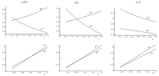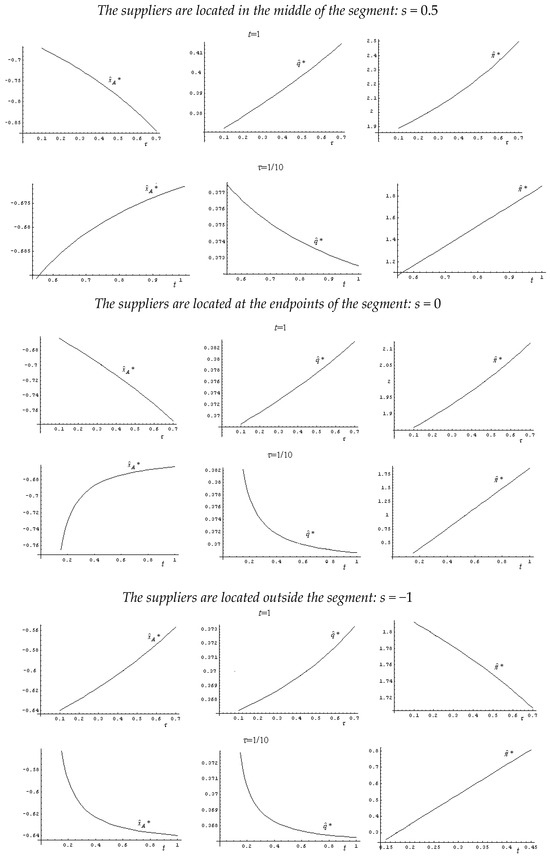 In this paper, we include the possibility that the firms incur transportation costs to procure the inputs they need to produce the final goods. This adds a fourth effect to the analysis, namely, a cost-saving effect: basically, all else equal, each downstream firm tries to save costs by locating closer to its input supplier. This explains the importance of the threshold . If , there are no transportation costs in equilibrium, so our model collapses into Brekke and Straume’s (2004) [19] framework. Therefore, the cost-saving effect vanishes in equilibrium. However, if , the location choices of the downstream firms are also determined by the aforementioned cost-saving effect, which comes on top of the other effects. Compared with the benchmark of Brekke and Straume (2004) [19], the downstream firms will relocate in the direction of the input suppliers. Thus, if , the equilibrium locations are such that the distance between the downstream firms is larger than the benchmark, whereas the opposite is true for . And how far away from the benchmark locations the firms will locate depends on the relative strength of the cost-saving effect, which, in turn, depends on the relative magnitudes of τ and t; the cost-saving effect depends on τ whereas all the other competition-related effects depend on t.