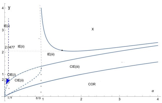 of case IE (iii) of Proposition 1) is an equilibrium. The greatest one belongs to the white area, where