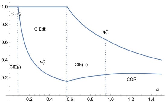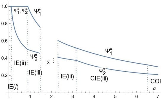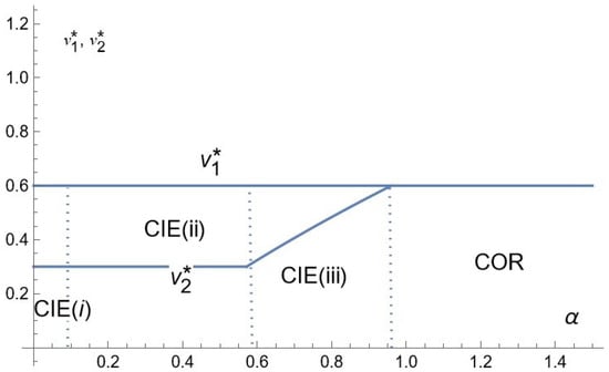 We must then have  and  Solving Equations (A2)–(A5), we obtain a unique solution, which is   and  Notice that  is non-negative if , while  iff