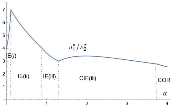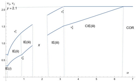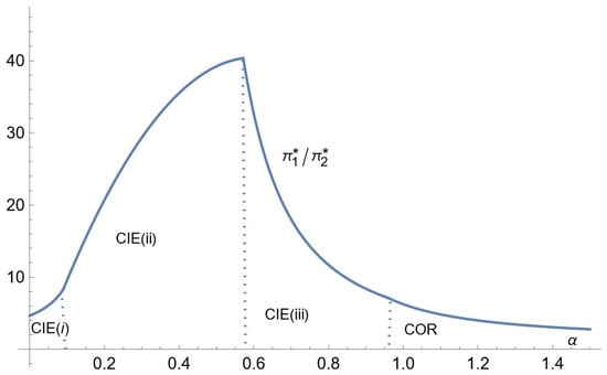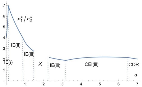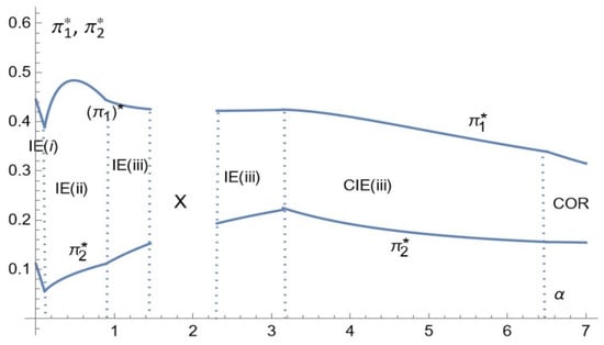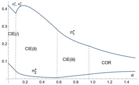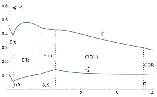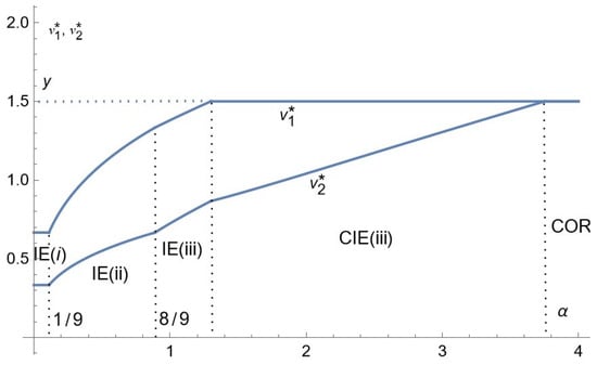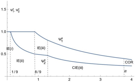 Indeed, if one of the , then necessarily, by Equations (A2) and (A3), the second . Hence, by Equations (A4) and (A5), prices are . But, , hence , then . But, we have just proved that  does not correspond to an equilibrium.
