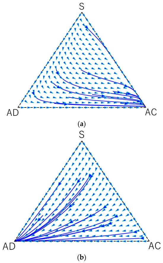 In the following numerical investigations, we fix parameter values as With these values, the conditions and hold if . Figure 1a–c display trajectories in the state space obtained by numerically integrating the replicator dynamics with and with , respectively.