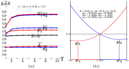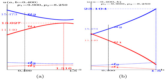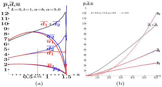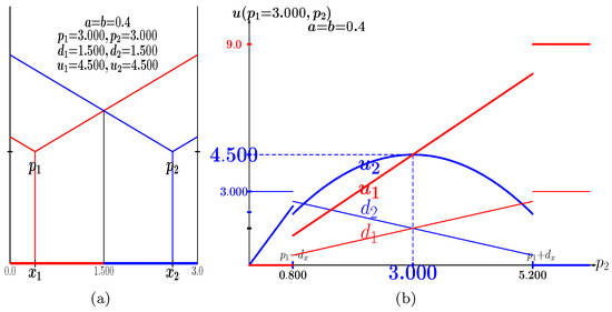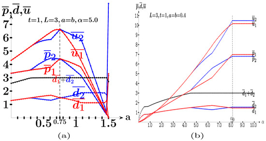 At variance with what is assumed in this study, in the simulations of Figure A3, the players are not restricted in their site location. Thus, in Figure A3a, it is , , with 25, the critical value of a from which the prices and payoffs of both players begin to decrease until they cancel out at . In Figure A3b, it is , , with 26. From , the follower notably increases his advantage over the leader so that when , i.e., when , the follower tends to obtain the whole market ().