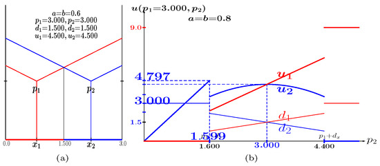 In the example of Figure 2, , , as in Figure 1. But now it is , so that the game shown in Figure 2a is not in NE. This becomes apparent in Figure 2b: the best response to is not . The best response to turns out to be . In a game in the scenario of Figure 2, but with , player 2 would undercut player 1 and would obtain the full market and as a result it would be , . The kind of best response in Figure 2 is denoted U in [9], i.e., , , 2.