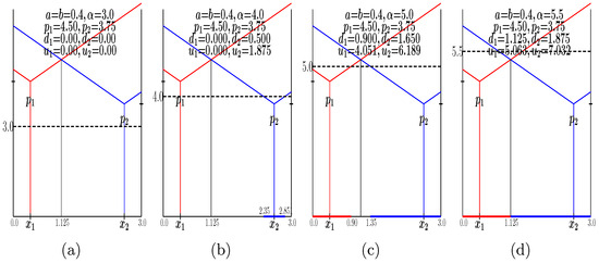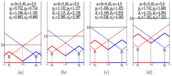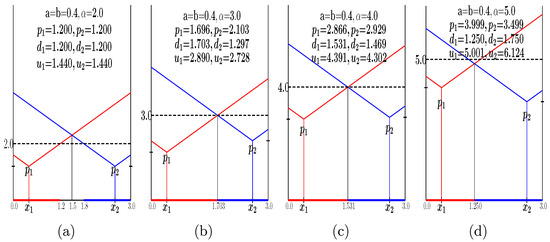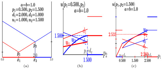 Let us exemplify the -HOT game by means of Figure 11, where departing from the game of Figure 5b, four values of are imposed. If is sufficiently high as to induce all the consumers to buy one unit of the product, the conventional Hotelling game is recovered; this is the case of Figure 11d, where . Opposite to this, with very small , not any consumer would buy from any seller; this is the case of Figure 11a, where . Intermediate values of may induce the emergence of local monopolies whose endpoints are computed according to Equation (7), departing from the locations where [12]. Thus, for example, in the game of Figure 11c with , it is , and ; that is, the consumers in the (0.00,0.90) interval buy from player 1, those in the (1.35,3.00) interval buy from player 2, and those in the interval do not buy from any player. In the game of Figure 11b with , no consumer buys from player 1, whereas the consumers in the interval buy from player 2 ().