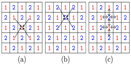 The game is iterated in a cellular automata (CA) manner, i.e., with uniform, local, and synchronous interactions. The arrows in the generic players in Figure 4 aim to make clear that the interactions are local, i.e., they involve only nearest neighbors. Thus, in the updating of prices steps (Figure 4a,b), both types of players scrutinize their NE–NW–SE–SW mate neighbors, whereas playing concerns (Figure 4c) the N–S–E–W partner neighbors.