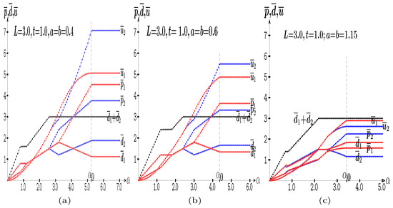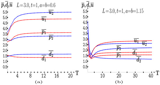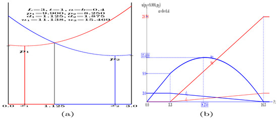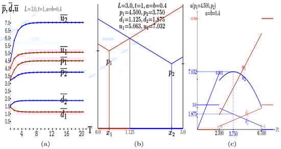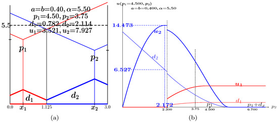 In Figure 7c, it is , . The price evolves according to Equation (3a) up to 10 and according to Equation (3b) in the in the b-interval. At , it is , ; at , it is ; and at , it is . At variance with what happens in Figure 7a,b, in Figure 7c, the average demand and payoffs of player 2 exceed those of player 1 for every value of b.