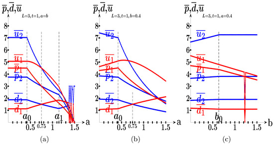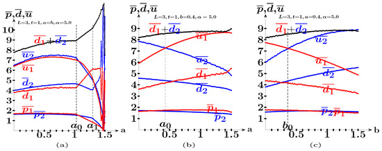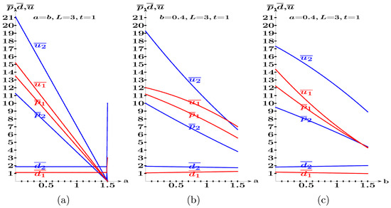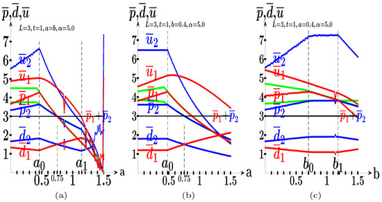In the scenario of Figure 9b, it is , and , where , . The average payoff of the follower exceeds that of the leader in Figure 9b except when a approaches . In the scenario of Figure 9c, it is , , where , .