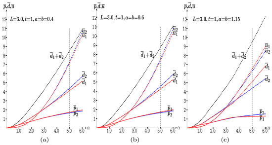 In the location-symmetric simulation of Figure 13a, at , it is , , , , , .The graphs in Figure 13a coincide with those in Figure 7a when , where the values of the prices are so small that the threshold plays no role in the final outcome. Therefore, at , it is , , so that , , , . The graphs in Figure 13b coincide with those in Figure 7b when . In Figure 7c, it is , .