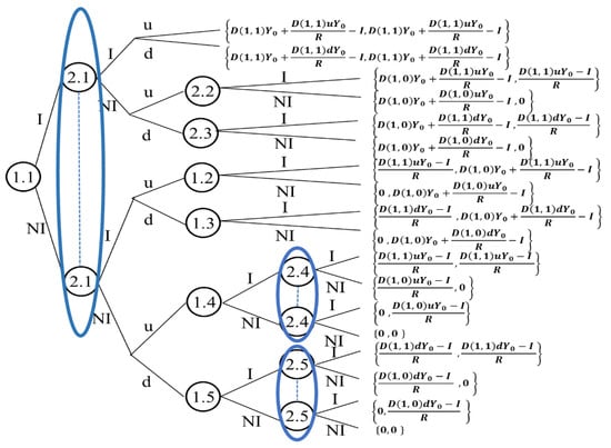 In Figure 1, the game is represented as a game in extensive form. Each has five information sets (1.1–1.5) for player 1 and information sets (2.1–2.2) for player 2. A strategy for the k player is a mapping from , where . Let denote the set of all strategies of player 1 while denote the set of all strategies of player 2. Moreover, let denote the set of all strategy profiles of the game. We say that some profile is a perfect Nash Equilibrium (SPNE) subgame of the game if its restriction to each subgame is a Nash Equilibrium of that subgame. Consider the following profiles: , , , where: