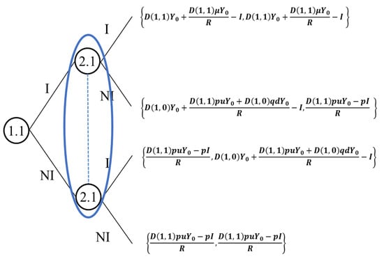 From inequalities , , and , we know that each firm will invest in the G state and will not invest in the B state in period 1 under all three strategies. Using backward induction, we can then proceed to period 0. The reduced period 0 game tree is given in Figure 3.