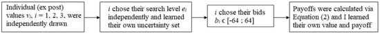 The experiment implemented two between-subject treatments: endogenous uncertainty and exogenous uncertainty, with the latter being the control treatment. Figure 1 illustrates the flow chart of each experimental period. Under exogenous uncertainty, was randomly and independently chosen by the computer in each period, with the corresponding cost deducted from the subject’s endowment before being told the set of possible values and the bid submission. In the endogenous uncertainty treatment, in contrast, the subjects were informed of the sign of their value before making their costly search effort choice .