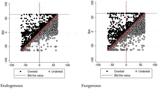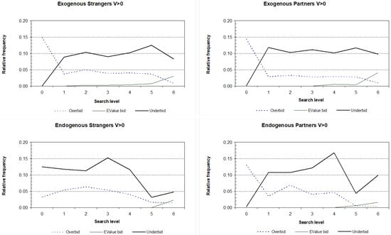 *** indicates a statistically significant result at the 0.01 level, ** at 0.05, and * at 0.1, based on the two-tailed Wilcoxon signed-ranks test. The test was conducted on 10 independent observations from groups of six subjects in the Endogenous and Exogenous treatments, respectively, and separately for the Partners and Strangers matching. For each independent observation, the average difference between the expected value and the bid was calculated, separately for negative and positive values. A positive Z-statistic indicates a tendency toward overbidding, while a negative value indicates underbidding. “Pooled” refers to pooled data across both matching protocols. Where indicated “All Data” the test was conducted on the 20 independent observations from both treatments.