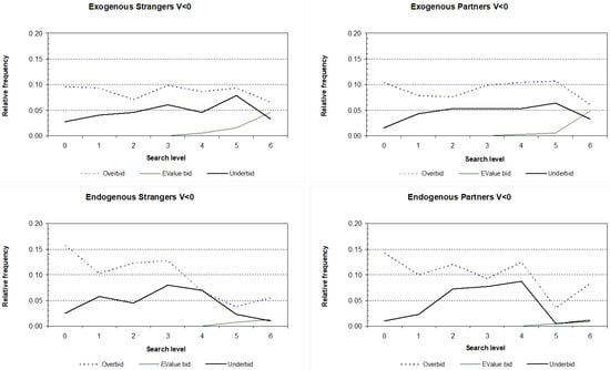To assess the search effort that symmetric agents would exert to maximize their individual payoff when using the benchmark bids, we conducted simulations using the matchings and (ex post) values identical to those in our data. The simulations showed that low search levels would be optimal for symmetric payoff maximization: a search level of 1 yielded the highest simulated group payoff within the expected-value benchmark, while a search level of 2 maximized the group payoff within the minimum-value benchmark.12 These results contrast sharply with the full resolution of uncertainty required to consistently achieve efficient outcomes at the bidding stage. To surpass 0.99 efficiency, search levels of 4 and 5 were required for the expected-value and minimum-value benchmarks, respectively.13 Overall, these simulation results suggest a trade-off between the search effort and higher bids. The minimum-value benchmark, representing lower bids that avoid losses, requires a higher optimal search level than the expected-value benchmark, which implies higher bids.14