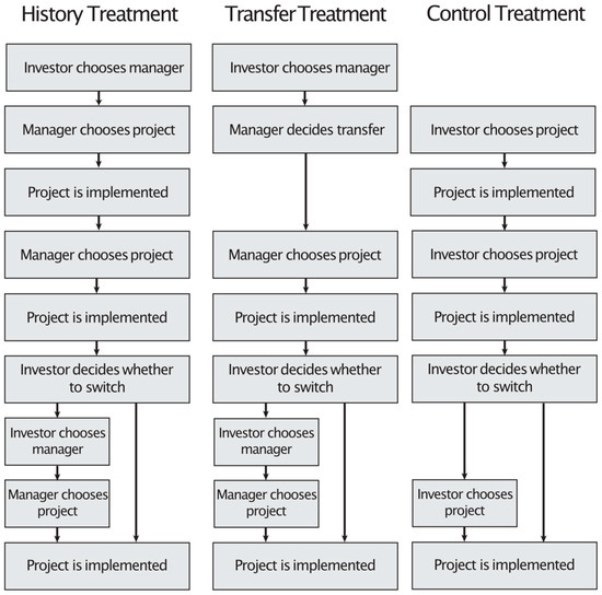 After deciding whether to transfer money or not, the manager chooses a project from a pool of eight different projects under the same procedure as in History and implements it in exactly the same way. Thereafter, investors face the same decision as in History, that is, either to stay with the same manager and project or to select a new manager, who then chooses a new project. See Figure 1.