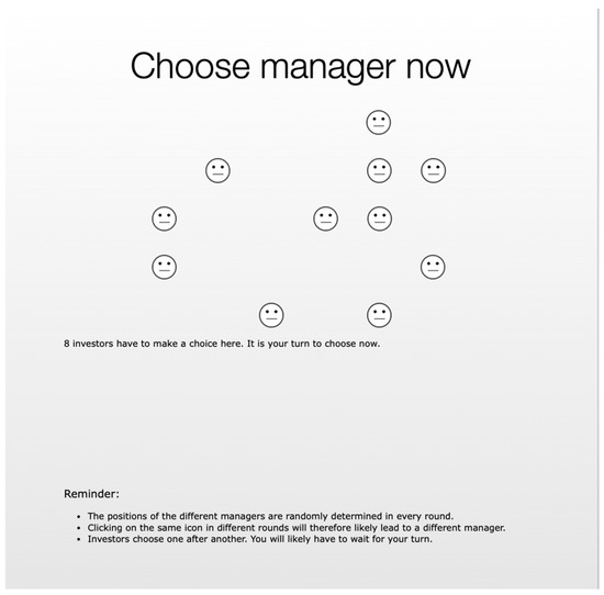 History has twice as many managers as investors, where the role of a participant in the computerized experiment is randomly allocated. At the beginning of each round, an investor chooses a manager from a pool of anonymous managers, who are presented in the form of identical icons spread across the computer screen of the participant (see Figure 2). The position of the icons is randomized in each round, so that the identities of the managers cannot be tracked across rounds. The order in which investors make this choice is randomized anew for each round. Investors who have not yet made a choice and managers who have not yet been chosen see the screen with all eligible icons until they have made a choice or have been chosen, respectively. Icons representing managers who have already been chosen by an investor disappear from the screen one after another. Managers are also informed which icon represents them. Managers who are not chosen by any investor are redirected to a waiting screen7.