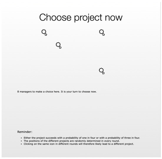 Managers selected by an investor choose one out of eight potential projects. Each project has a success probability of either 1/4 or 3/4. Both types of projects are equally likely, and neither investors nor managers can identify the projects at the time of choosing (their positions on the screen are randomized anew for every decision). The decisions are made in the same order as the choices of the investors, so that a manager who is chosen third is also the third to choose a project. Since all managers select from the same set of projects, for a manager who has been picked last, only one project remains. The project choice screen works in the same way as the investor screen: randomly positioned projects disappear one after another once they are chosen and are no longer available to other managers (see Figure 3). After selecting a project, a manager is asked to “implement” it by clicking on a box that symbolizes the project. Both investor and manager watch a 5-second-long animation resembling the “processing” animation typically found on computers, after which the success or failure of the project is announced.