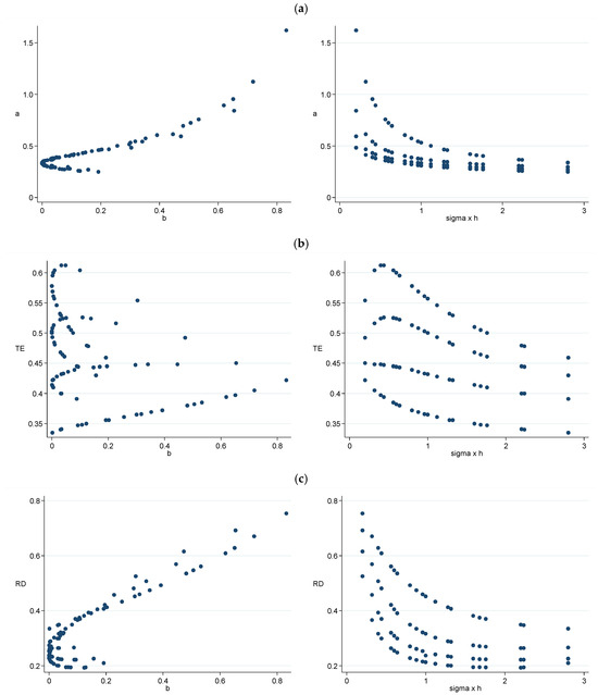 (a) Changes in a depending on b and . (b) Changes in TE depending on b and . (c) Changes in RD depending on b and .