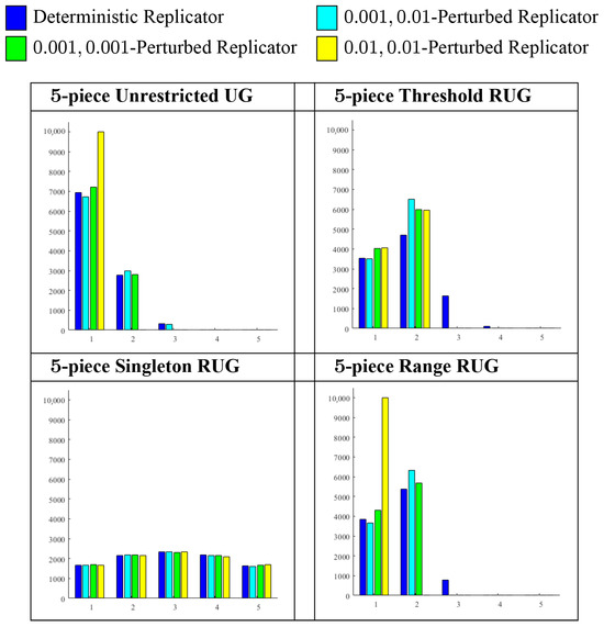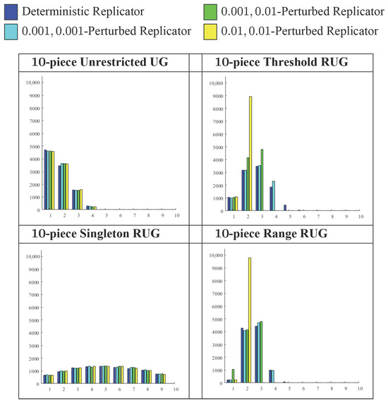 Table 1 summarizes the -convergence rates of the simulations run on the four 5-piece Ultimatum games. For example, for the Unrestricted 5-piece Ultimatum Game and the -perturbed replicator dynamic where , the convergence rate was since 9999 of the 10,000 orbit pairs of this simulation converged to the level. For this game and the deterministic replicator dynamic, the -perturbed replicator dynamic and the -perturbed replicator dynamic, the convergence rate was because, for these simulations, all 10,000 orbit pairs converged to the level.