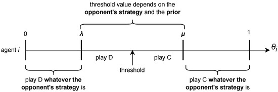Threshold strategy is a core concept developed for both the continuous and the discrete type space games with two actions. As we saw, a threshold strategy is fully characterized by its threshold and defines three regions in the type space: one associated to a pure action C, one associated to a pure action D, and one associated to a mix. By construction, the best response must be a threshold strategy. The threshold strategies presented for the DGPD are the more basic version where we play D if , play C if , and a mix of both if .