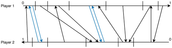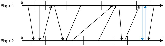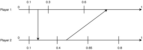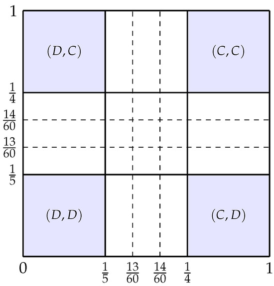 We suppose that the probability distribution for the game is absolutely continuous with respect to the Lebesgue measure: Denote the Lebesgue measure on by ; if p is a probability distribution on , then the probability distribution p is absolutely continuous with respect to if for any measurable set E, we have . Let be the probability distribution for agent . We assume that we can use a probability density function: recall that, for any measurable set E, the probability density function satisfies: