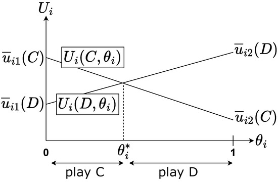 We aim to evaluate whether agent i with type and opponents’ strategy prefers to play C or D. We compare and :